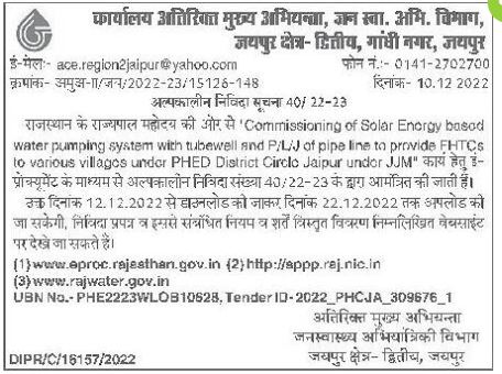 Tender for ‘Commissioning of Solar Energy basad’ on behalf of the Governor of Rajasthan water pumping system with tubewell and P/L/J of pipe line to provide FHTCs to various villages under PHED District Circle Jaipur under JJM