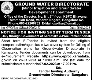 Tender for companies/firm/agencies in two cover system for Drilling of Observation wells for Groundwater Directorate in Karnataka.