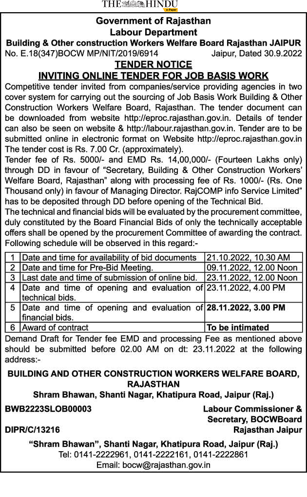 Tender for companies/service providing agencies in two cover system for carrying out the sourcing of Job Basis Work Building & Other Construction Workers Welfare Board, Rajasthan.