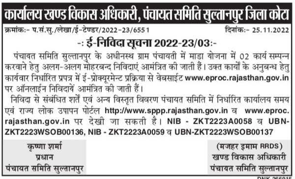 Tender for completion of 02 works in Mada Yojana in Gram Panchayati under Panchayat Samiti Sultanpur.