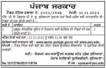 21.11.2022 S. P. oh Department P. A. U. Online e-tenders are invited for the