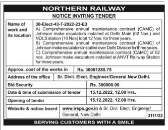 Tender for Comprehensive annual maintenance contract (CAMC) of Johnson make escalators installed at Delhi Main (02 Nos.) and NDLS station (10 Nos) total 12 Nos. for three years.