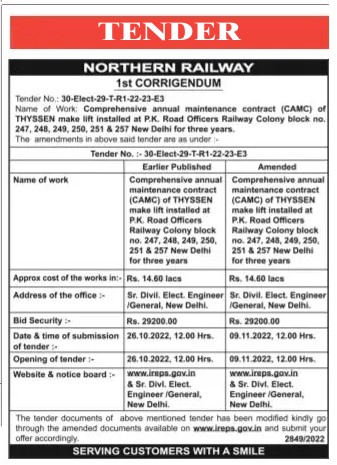 Tender for Comprehensive annual maintenance contract (CAMC) of THYSSEN make lift installed at P.K. Road Officers Railway Colony block no. 247, 248, 249, 250, 251 & 257 New Delhi for three years