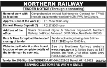 Tender for Comprehensive Annual Maintenance Contract for TPWS line side equipment for section HNZM-PWL for 03 years