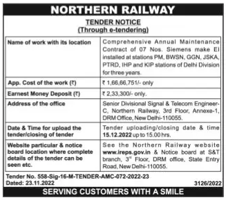 Tender for Comprehensive Annual Maintenance Contract of 07 Nos. Siemens make El installed at stations PM, BWSN, GGN, JSKA, PTRD, IHP and KIP stations of Delhi Division) for three years.