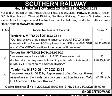 Tender for “Comprehensive annual maintenance contract of SCADA system ₹ compete with software, RCC equipment and RTUs in MAS GDR and VLCY-MSB-VM sections for a period of three years”