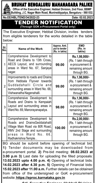 Tender for Comprehensive Development to Roads and DrainsGeddalahalli Village Main Road via 80ft Road, RMV 2nd Stage and surrounding areas in Ward No. 66, Radhakrishna Temple..