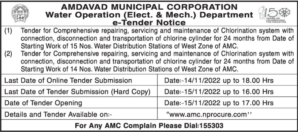 Tender for Comprehensive repairing, servicing and maintenance of Chlorination system with connection, disconnection and transportation of chlorine cylinder for 24 months from Date of Starting Work of 14 Nos. Water Distribution Stations of West Zone of AMC.