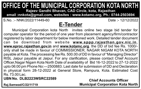 tender for computer operator for the period of one year from placement agency/firm/contractor registered by labor department for below mentioned work.