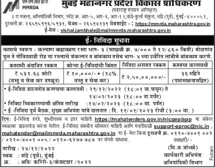 Tender for : Concept and Construction of Kalyan External Diversion Road Part-3 (Chain Nos. 7/000 to 12/860 km) from Mothagaon Bridge to Govindwadi Road as well as remaining length of Part-4