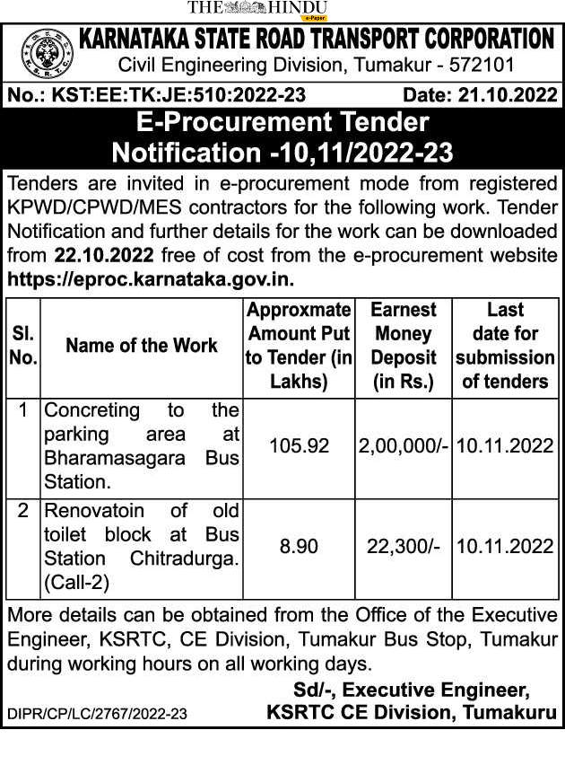 Tender for Concreting to the parking area Bharamasagara Bus Station.
