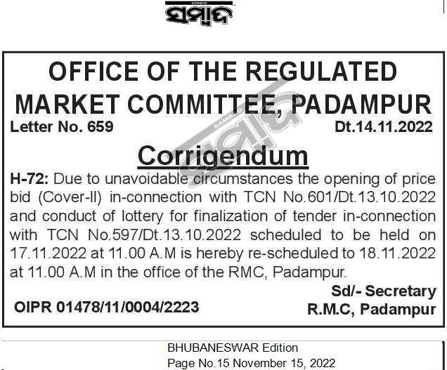 Due to unavoidable circumstances the opening of price bid (Cover-ll) in-connection with TCN No.601/Dt.13.10.2022 and conduct of lottery for finalization of tender in-connection with TCN No.597/Dt.13.10.2022