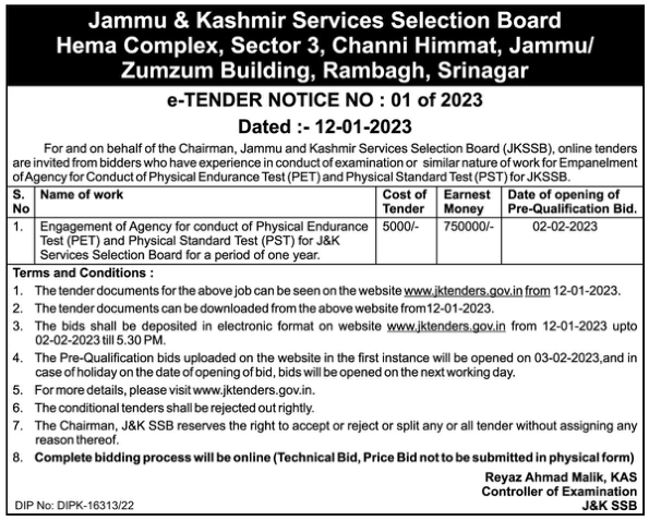 Engagement of Agency for conduct of Physical Endurance Test (PET) and Physical Standard Test (PST) for J&K Services Selection Board for a period of one year.