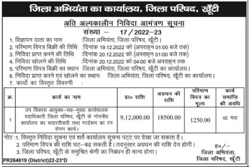 Tender for Confidential of Deputy Development Commissioner cum Chief Executive Officer Zilla Parishad, Khunti 1 Office boundary wall and guardroom painting work