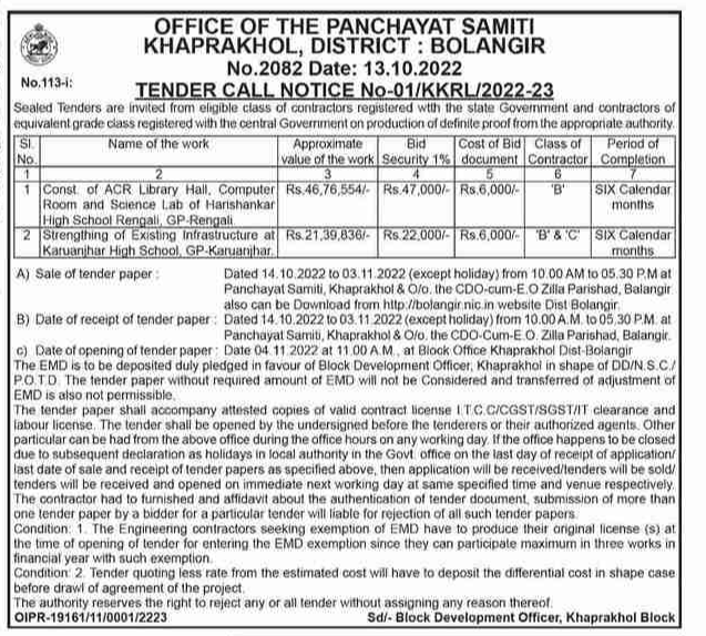 Tender for Const of ACR Library Hall. Computer Room and Science Lab of Harishankar High School Rengali, GP-Rengali