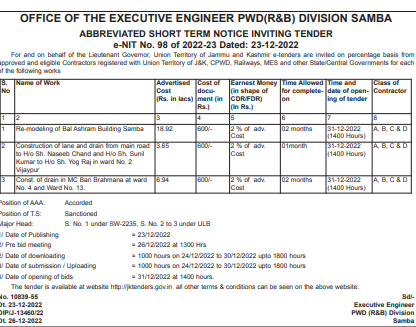 Tender for Const. of drain in MC Bari Brahmana at ward No. 4 and Ward No. 13.