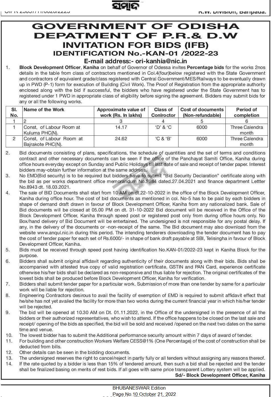 Tender for Const, of Labor Room at Bajrakote PHC(N).