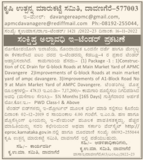 Tender For Construc- tion of CC Drain for G-block Roads at Main Market Yard of APMC Davangere