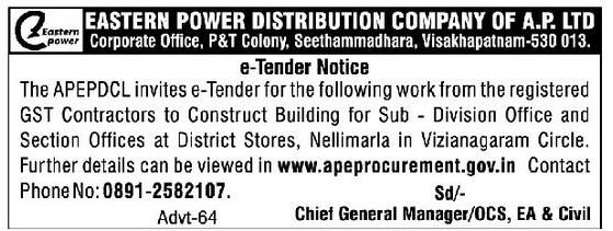 Tender for Construct Building for Sub – Division Office and Section Offices at District Stores, Nellimarla in Vizianagaram Circle.