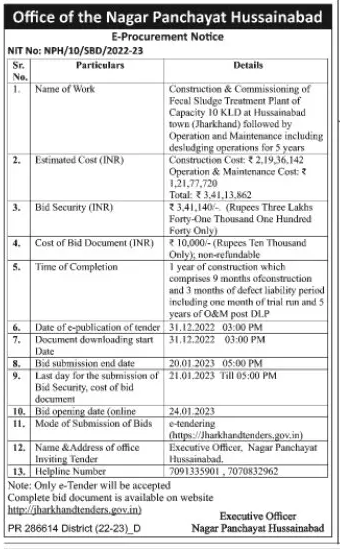 Tender for Construction & Commissioning of Fecal Sludge Treatment Plant of Capacity 10 KLD at Hussainabad town (Jharkhand) followed by Operation and Maintenance including desludging operations for 5 years