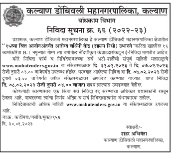 Tender for Construction Department The Administrator, Kalyan Dombivli Municipal Corporation invites e-tenders from registered contractors of appropriate category in B-1 pattern for the following 16 works for Establishment of Health Promotion Center (Government Fund) under 15th Finance Commission in Kalyan Dombivli Municipal Corporation area.