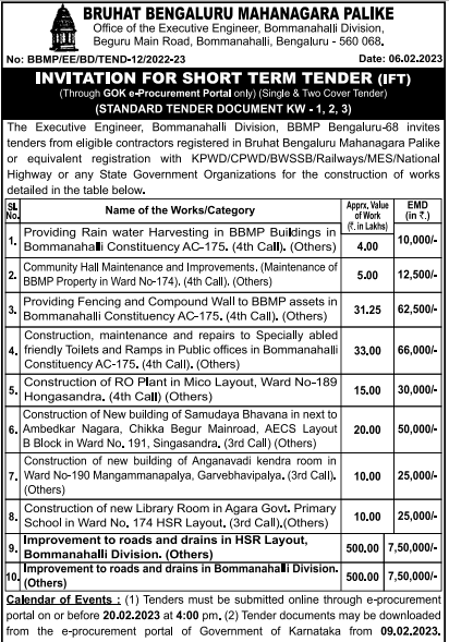Tender for Construction, maintenance and repairs to Specially abled  friendly Toilets and Ramps in Public offices in Bommanahalli Constituency AC-175.