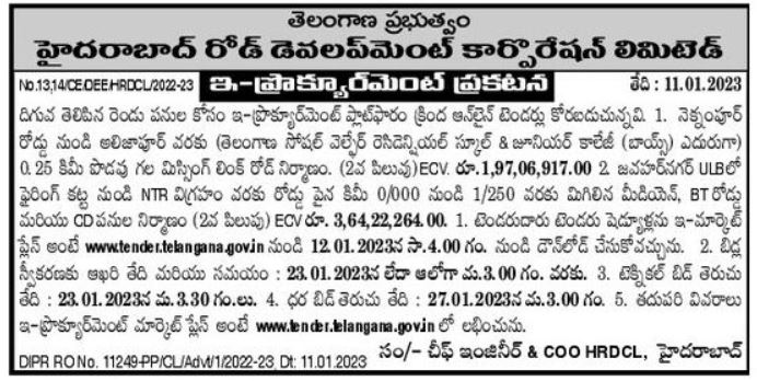 Tender for Construction of 0.25 km long Missing Link Road from Neknampur Road to Alijapur Social Welfare Residential