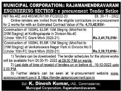Tender for Construction of 1000KL ELSR 15M Staging (Modified to 21M Staging) at Kotilingalapeta in Division No.40 (Under 15th FC Grant Work 2020-21)
