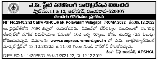 Tender for construction of 102 houses with basic facilities works at Velagapalli layout in Devipatnam mandal in Rampachodavaram division in ASR district of Andhra Pradesh.