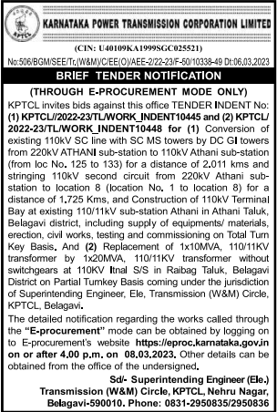 Tender for Construction of 110kV Terminal Bay at existing 110/11KV sub-station Athani in Athani Taluk, Belagavi district, including supply of equipments/ materials, erection, civil works, testing and commissioning on Total Turn Key Basis.