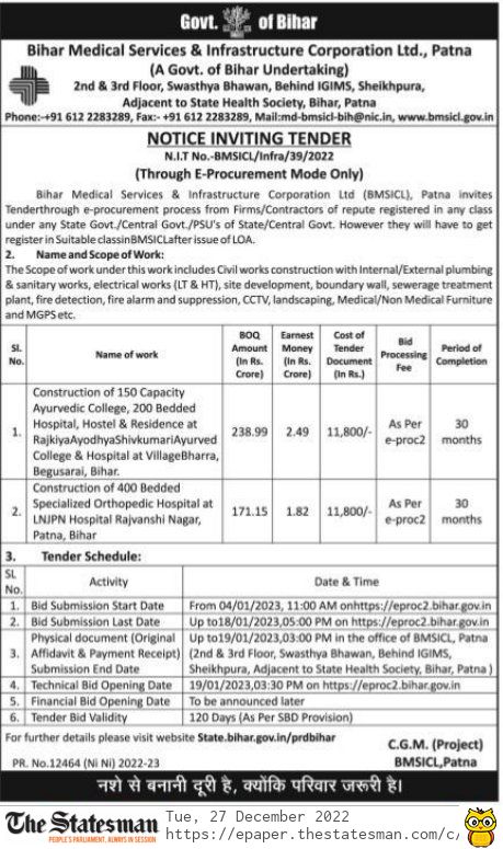 Tender for Construction of 150 Capacity Ayurvedic College, 200 Bedded Hospital, Hostel & Residence at RajkiyaAyodhyaShivkumariAyurved College & Hospital at VillageBharra, Begusarai, Bihar.