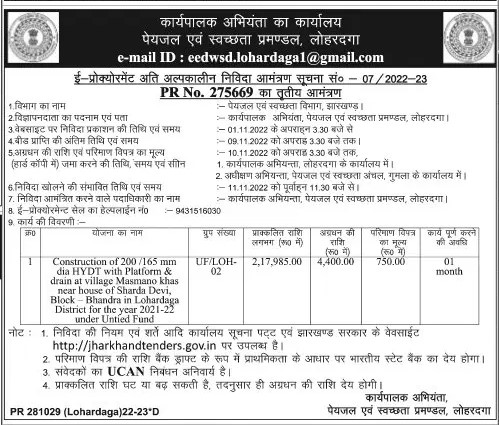 Tender for Construction of 200 / 165 mm dia HYDT with Platform & drain