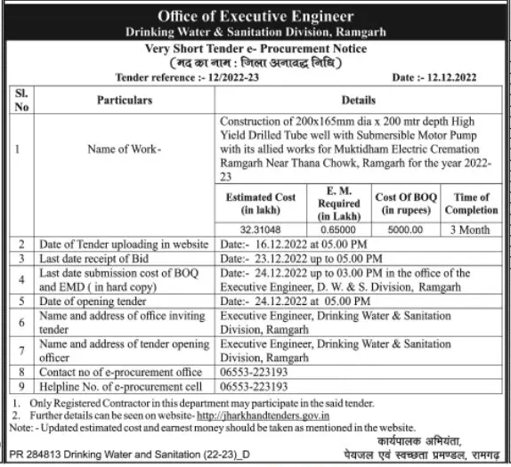 Tender for Construction of 200x165mm dia x 200 mtr depth High Yield Drilled Tube well with Submersible Motor Pump with its allied works for Muktidham Electric Cremation Ramgarh Near Thana Chowk, Ramgarh for the year 2022- 23