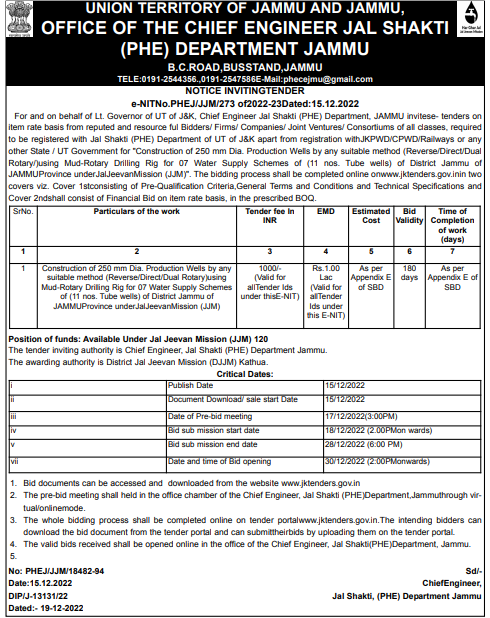 Tender for Construction of 250 mm Dia. Production Wells by any suitable method (Reverse/Direct/Dual Rotary)using Mud-Rotary Drilling Rig for 07 Water Supply Schemes of (11 nos. Tube wells) of District Jammu of JAMMUProvince under JalJeevan Mission (JJM)