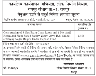 Tender for Construction of 3 Nos Extra Class Room and 1 No. Staff Room 2nd Floor Sahed Sanjay Yaday Govt. H.S. School at Sanjay Nagar Raipur Under Deposit Fund