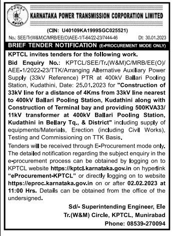 Tender for Construction of 33kV line for a distance of 4Kms from 33kV line nearest to 400kV Ballari Pooling Station, Kudathini along with Construction of Terminal bay and providing 500KVA33/ 11kV transformer at 400kV Ballari Pooling Station, Kudathini in Bellary Tq., & District