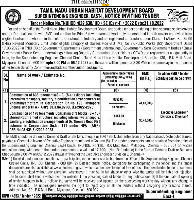 Tender for Construction of 638 tenements (S+9). (S+11) floors including internal water supply, sanitary, electrification arrangements