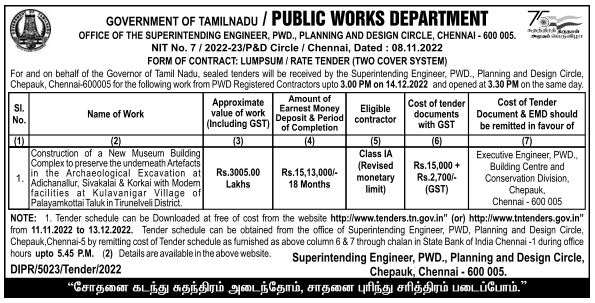 Construction of a New Museum Building Complex to preserve the underneath Artefacts in the Archaeological Excavation at Adichanallur, Sivakalai & Korkai with Modem facilities at Kulavanigar Village of Palayamkottai Taluk in Tirunelveli District.
