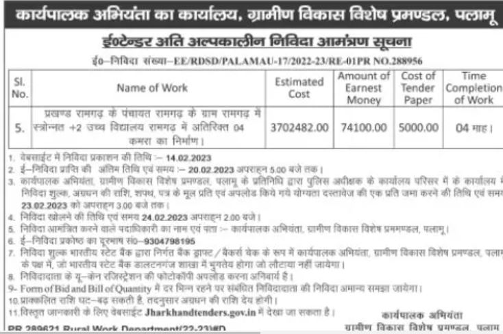Tender for Construction of additional 04 rooms in upgraded +2 High School Ramgarh in village Ramgarh of Panchayat Ramgarh of Block Ramgarh.