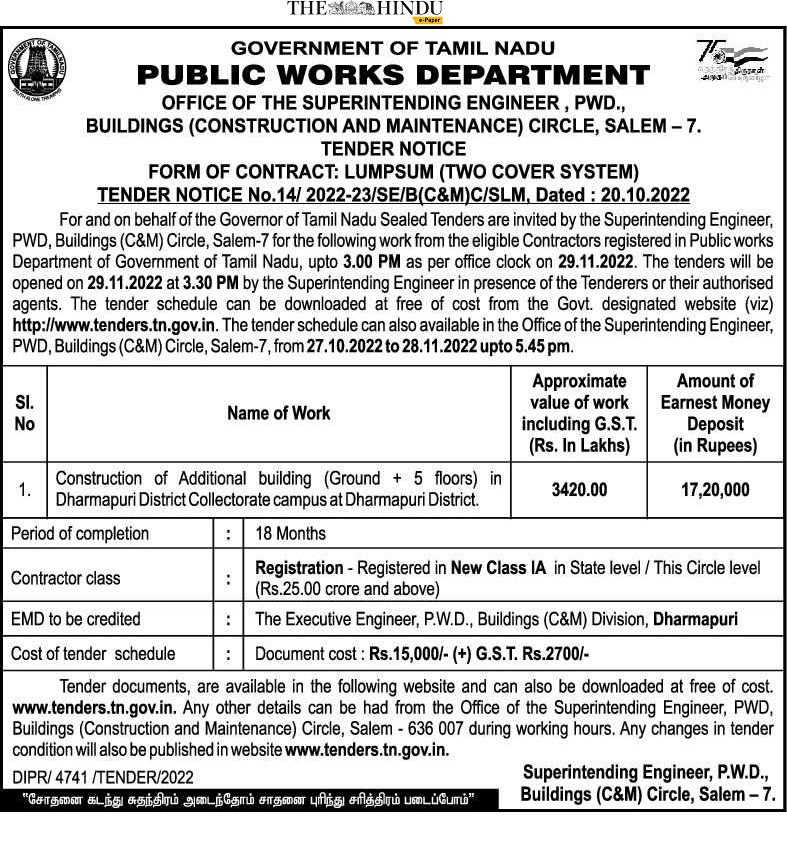 Construction of Additional building (Ground + 5 floors) in Dharmapuri District Collectorate campus at Dharmapuri District.