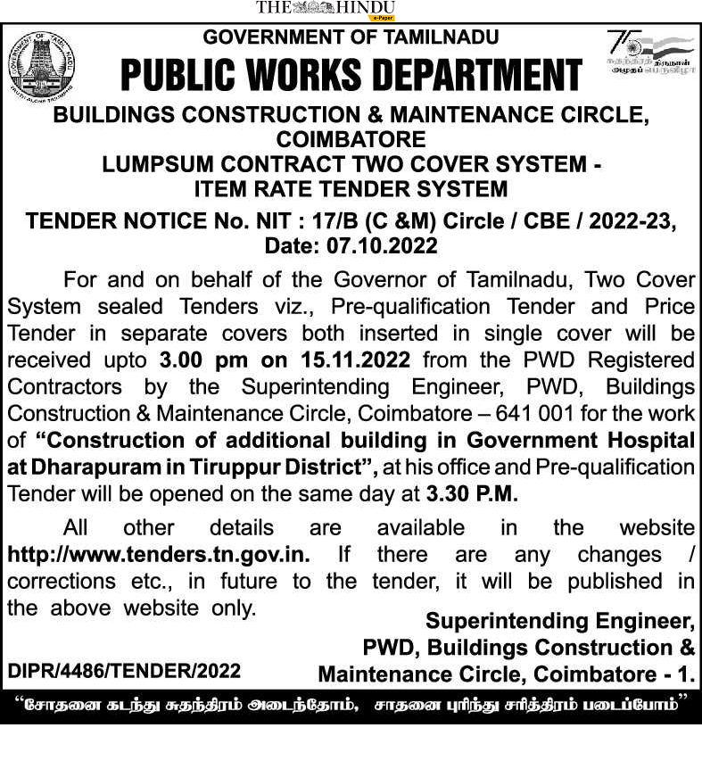 “Construction of additional building in Government Hospital at Dharapuram in Tiruppur District”,