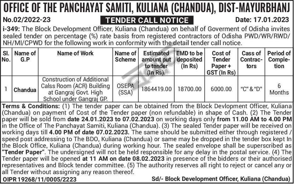Tender for Construction of Additional Calss Room (ACR) Building at Gangraj Govt. High School under Gangraj GP.