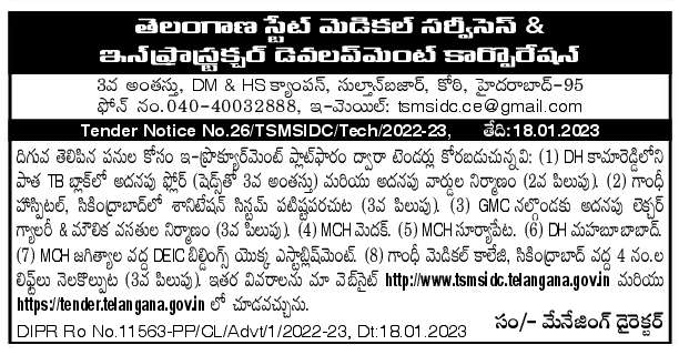 Tenders are invited through e-procurement platform for the following works: (1) Construction of additional floor (3rd floor with sheds) and additional wards (2nd call) in Old TB Block at DH Kamareddy (2) Gandhi | Strengthening Sanitation System in Hospital, Secunderabad (3rd Call) (3) Additional Lecture to GMC Nalgonda | Gallery & Infrastructure Construction (3rd Call) (4) MCH Medak. (5) MCH Suryapet. (6) DH Mahbubabad. (7) Establishment of DEIC Buildings at MCH Jagittala. (8) Construction of 4 Nos. lifts at Gandhi Medical College, Secunderabad (3rd call).