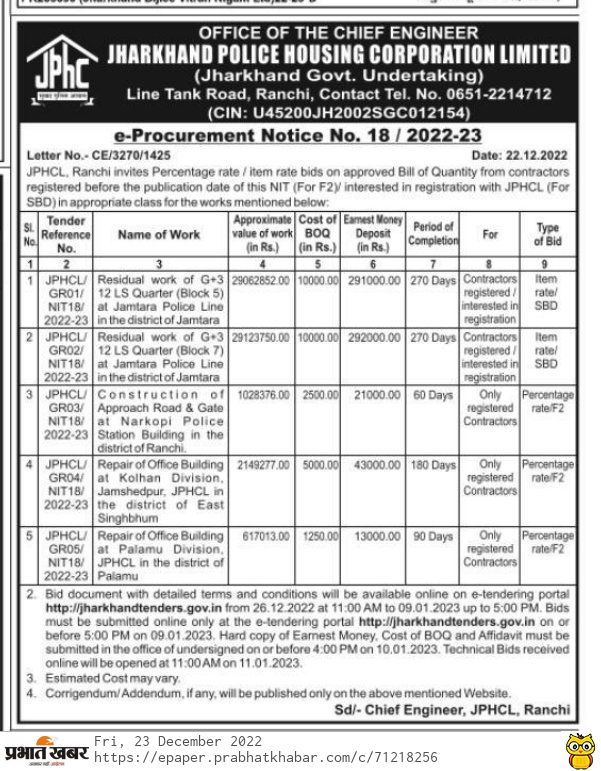 Tender for Construction of Approach Road & Gate at Narkopi Police Station Building in the district of Ranchi.