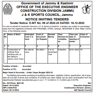 Tender for Construction of Artificial Rock climbing wall, at MA Stadium Jammu (2nd Time)