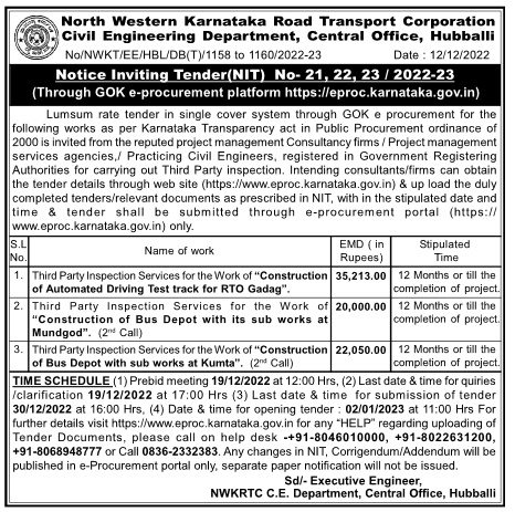 Third Party Inspection Services for the Work of Construction of Automated Driving Test track for RTO Gadag. Third Party Inspection Services for the Work of 20,000.00 Construction of Bus Depot with its sub works at Mundgod. (2nd Call) Construction
