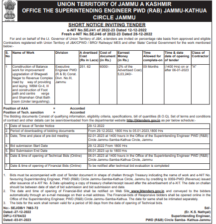 Tender for Construction of Balance Executive work for improvement upgradation of Bhagwati Nagar to Revenue Complex road by way of providing Jammu and laying WBM Gr and construction of Foot path and centre verge and Shamshan Chat Bath room (Under languishing).