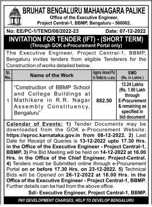 Tender for “Construction of BBMP School and College Buildings at Mathikere in R.R. Nagar Assembly Constituency. Bengaluru”