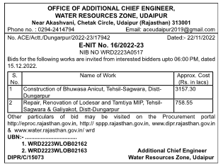Tender for Construction of Bhuwasa Anicut, Tehsil-Sagwara, Distt-Dungarpur Repair, Renovation of Lodesar and Tambiya MIP, Tehsil- Sagwara & Galiyakot, Distt-Dungarpur