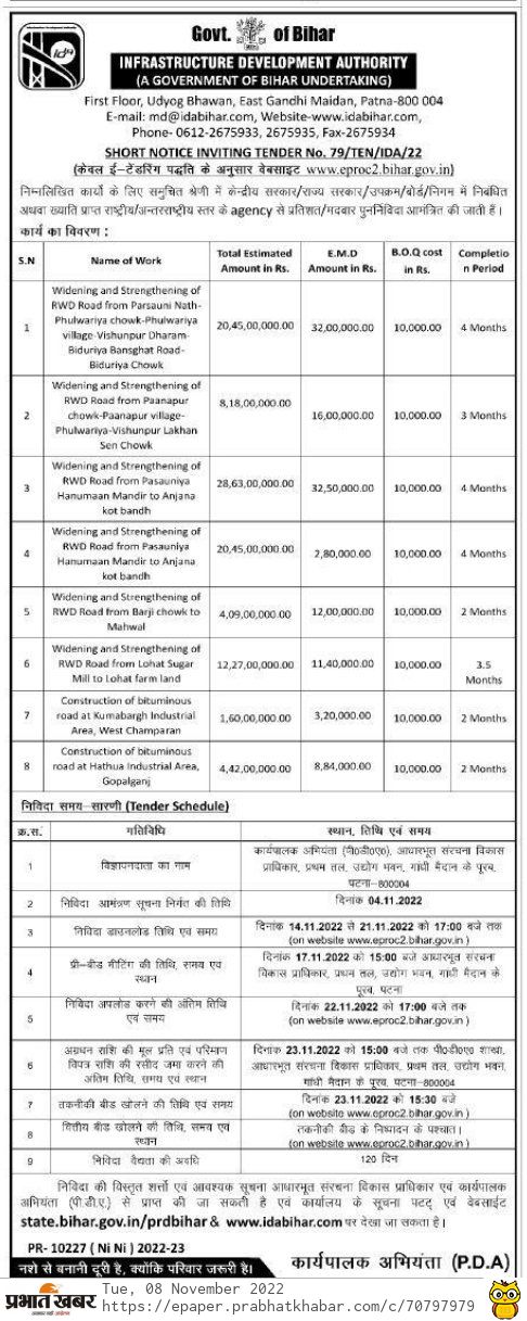 Tender for Construction of bituminous road at Kumabargh Industrial Area, West Champaran